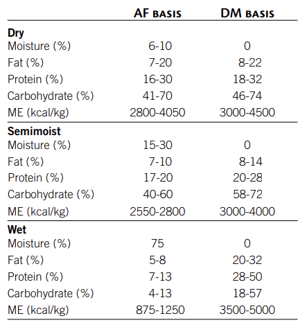 많은 반 축축한 개 사료 및 간식의 높은 단순 당 함량은 이러한 제품의 기호성과 소화율에 기여한다. 개는 단순당의 맛을 즐기는 것으로 나타났지만 고양이는 단 음식을 덜 선택한다. 단순 탄수화물의 비율이 높은 반습식 사료는 습식 사료와 유사한 소화 계수를 가지고 있다. 그러나 지방 함량이 낮기 때문에 반습 식품의 칼로리 밀도는 일반적으로 적다. 반습 식품의 ME 함량은 일반적으로 DMB에서 3000~4000kcal/kg 또는 약 1400~1800kcal/lb이다. 반습 식품은 DMB에서 20~28%의 단백질과 8~14%의 지방을 포함한다. 반습 식품의 탄수화물 비율은 건조식품의 비율과 유사하다. 그러나 중요한 차이점은 반습식 사료의 탄수화물은 대부분 단순 탄수화물 형태이며 상대적으로 적은 비율의 전분이 존재한다는 것이다.